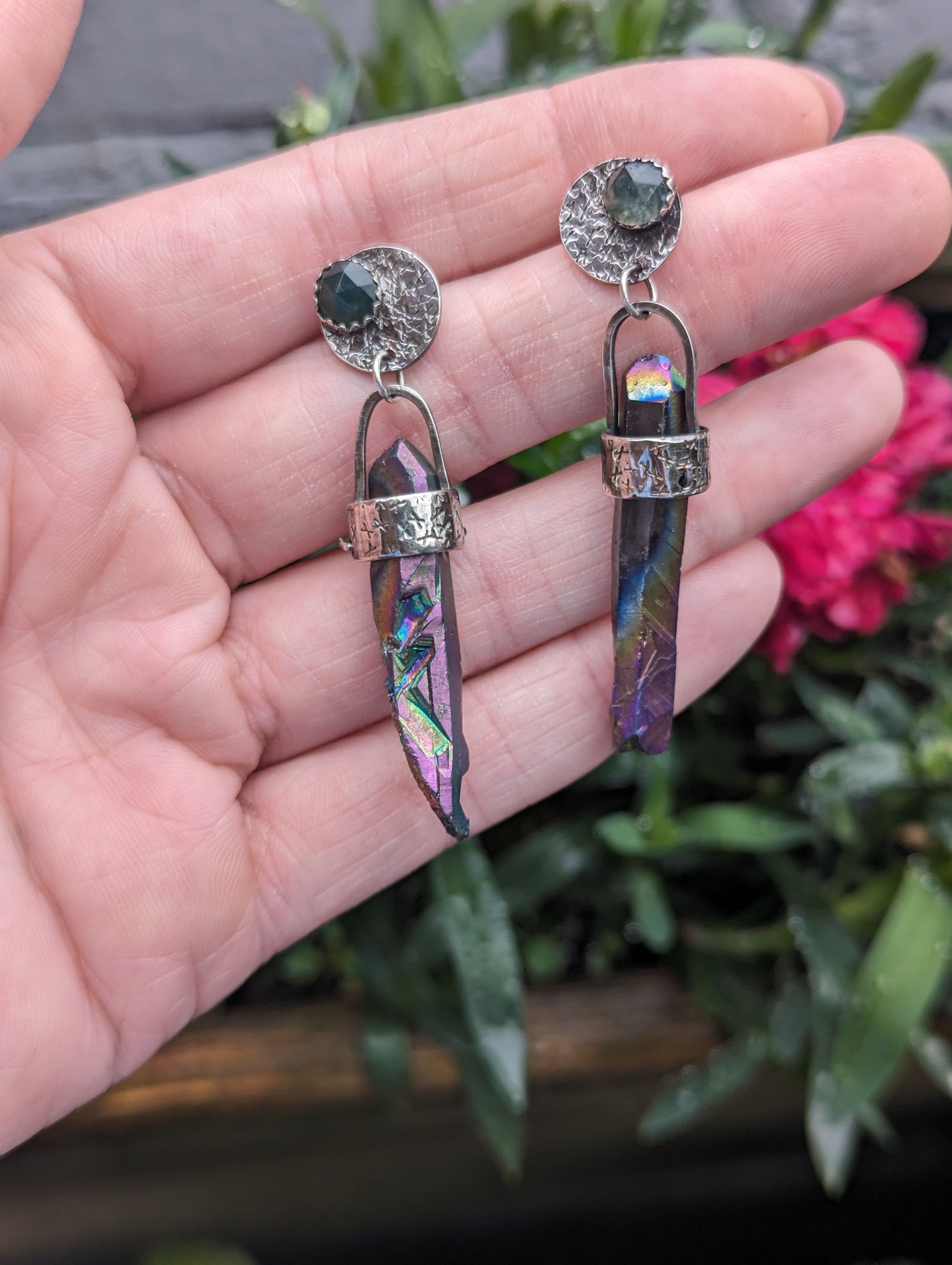 Brutalist Rainbow Quartz Earrings with Moss Agate Studs
