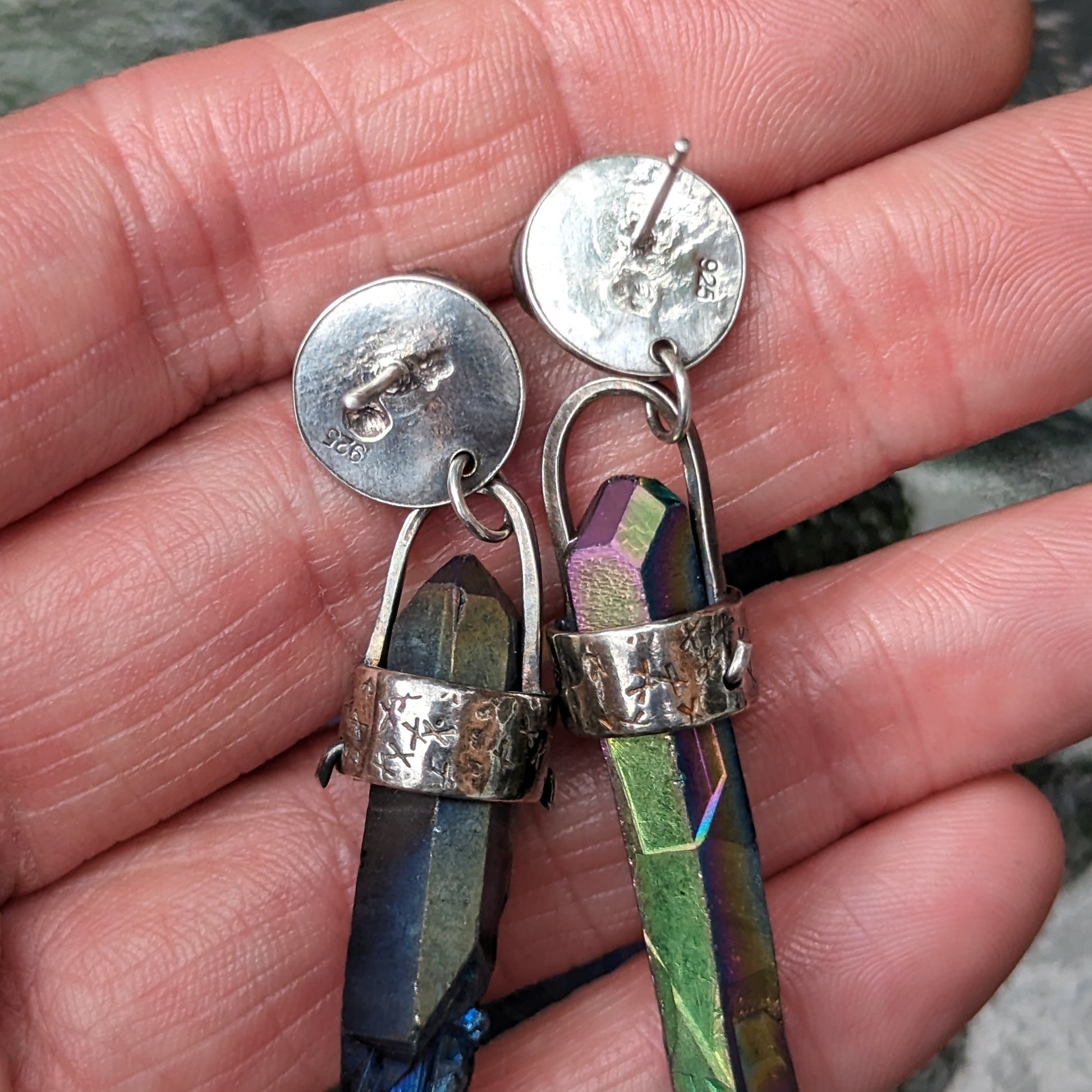 These one-of-a-kind earrings blend the raw beauty of natural crystals with the bold, architectural style of brutalist design. Each earring features a stunning rainbow quartz crystal, encased in a textured sterling silver structure that hangs from a sterling silver stud adorned with a green rose cut moss agate. The silver has been oxidised to enhance the texture and brutalist design.