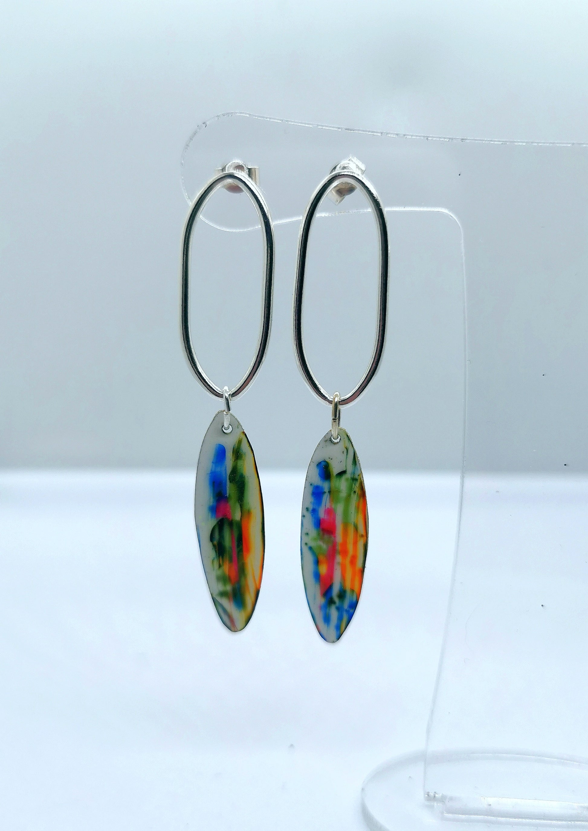 These beautiful stud earrings with a 6cm drop, are made with a ethically sourced 925 silver hoop and enamelled brass. I use paint techniques to create colour and heated enamel to seal in the designs.