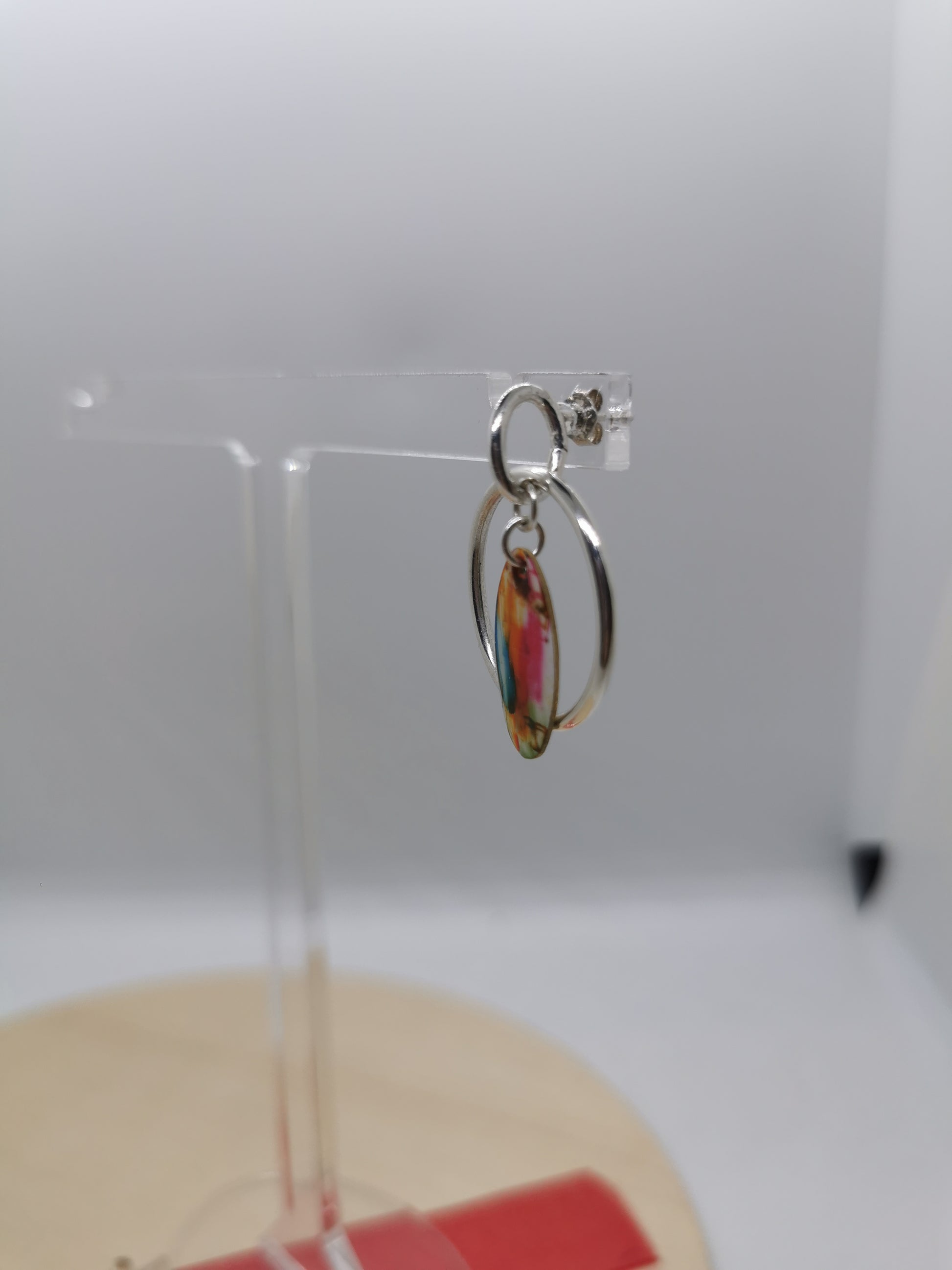 These beautiful stud earrings with a 6cm drop, are made with a ethically sourced 925 silver hoop and enamelled brass. I use paint techniques to create colour and heated enamel to seal in the designs.