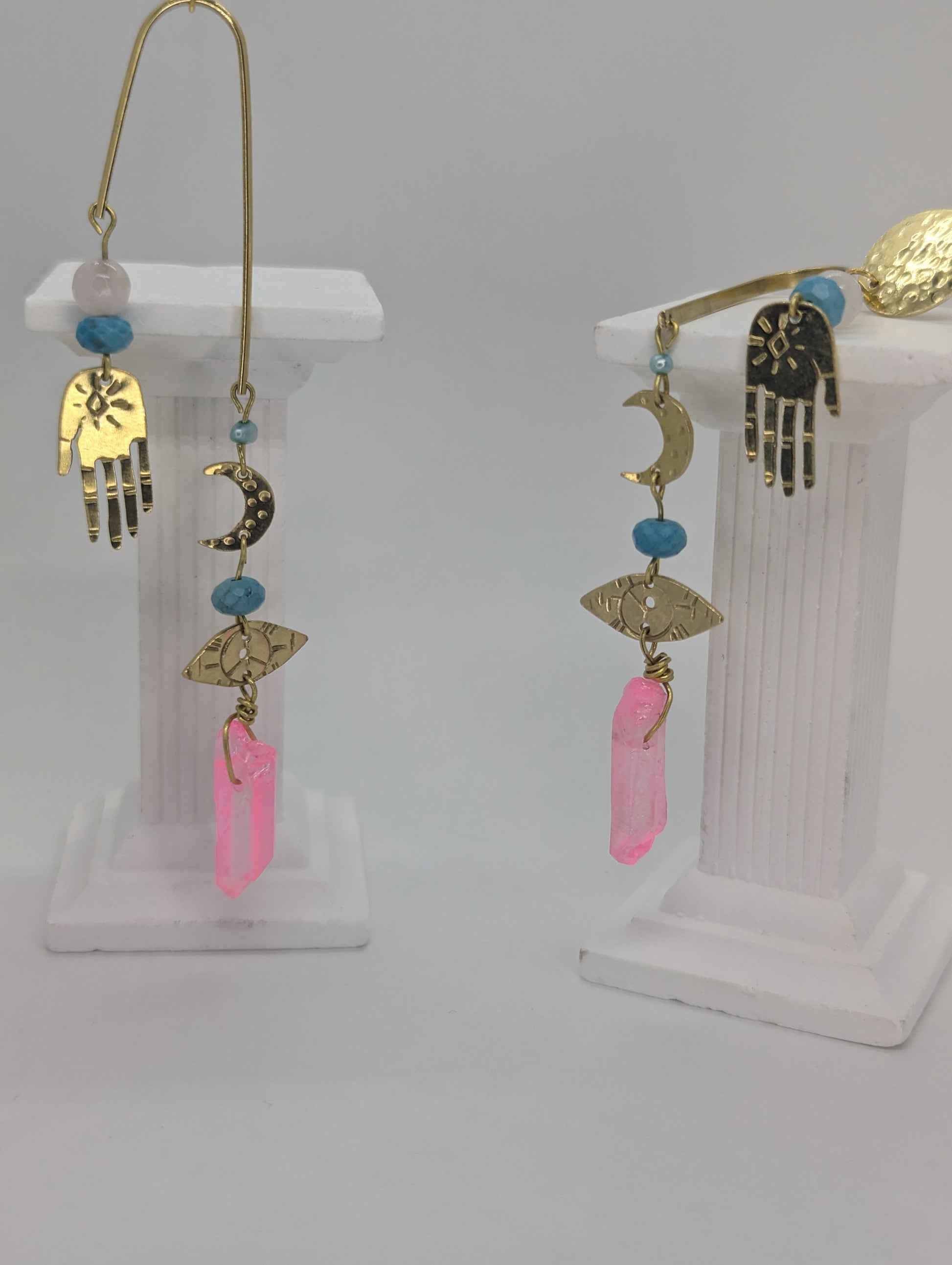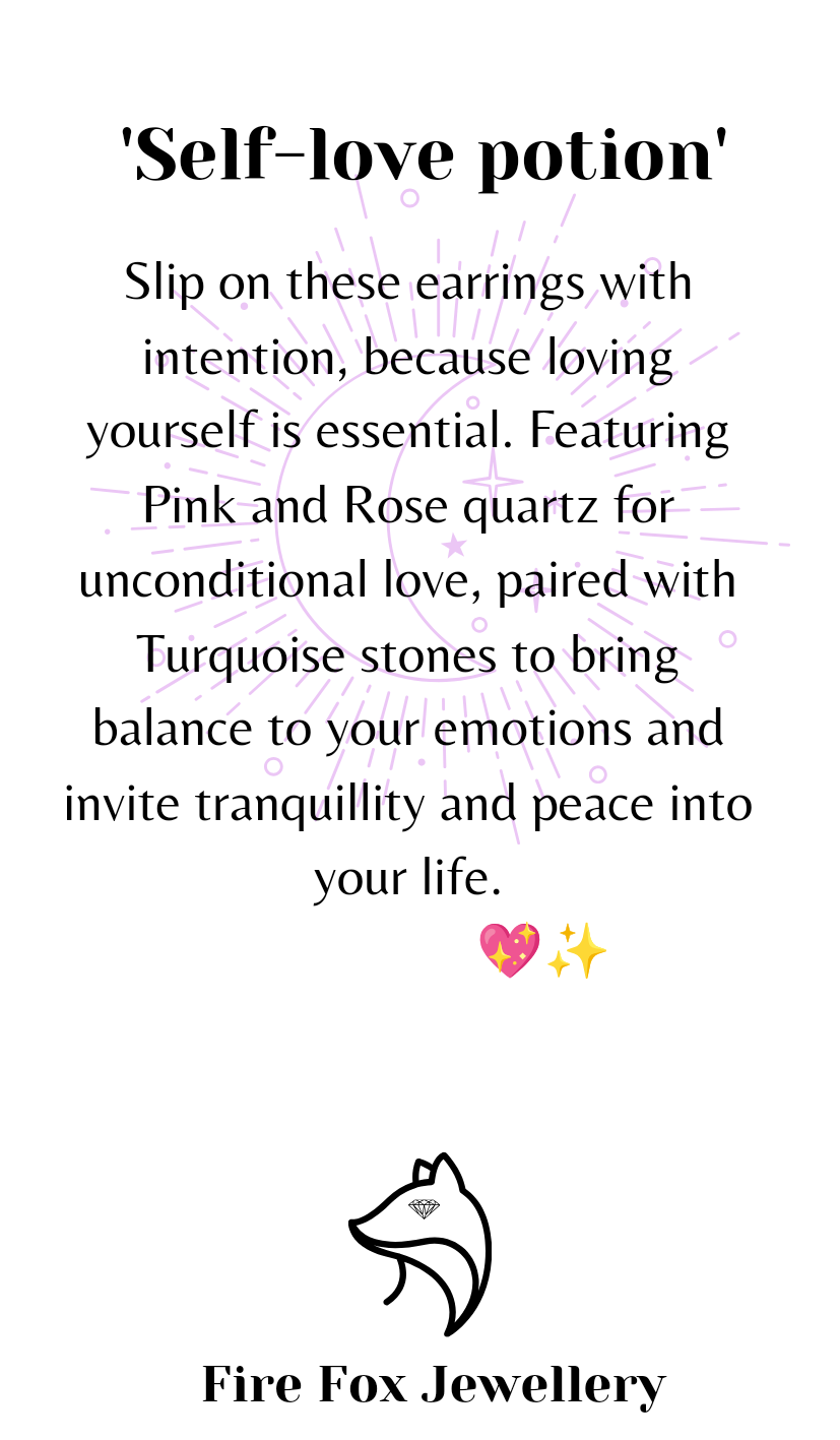 Indulge in self-love with our Self-Love Potion earrings. Adorned with rose quartz, pink quartz, and calming turquoise, these handcrafted raw brass earrings feature a full moon stud back in sterling silver. These celestial-inspired earrings radiate love and intention, making them a luxurious addition to any outfit.
