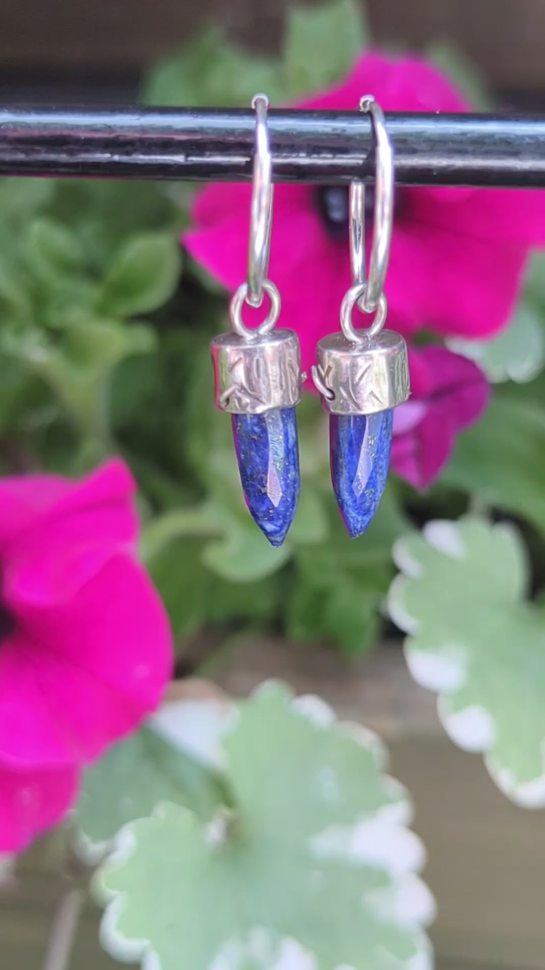 Step into your power with these Lapis Lazuli Bullet Crystal Earrings, hanging gracefully from sterling silver hoops. Each deep blue crystal point — flecked with hints of gold — drops 3.5cm, evoking the night sky and all its infinite wisdom.