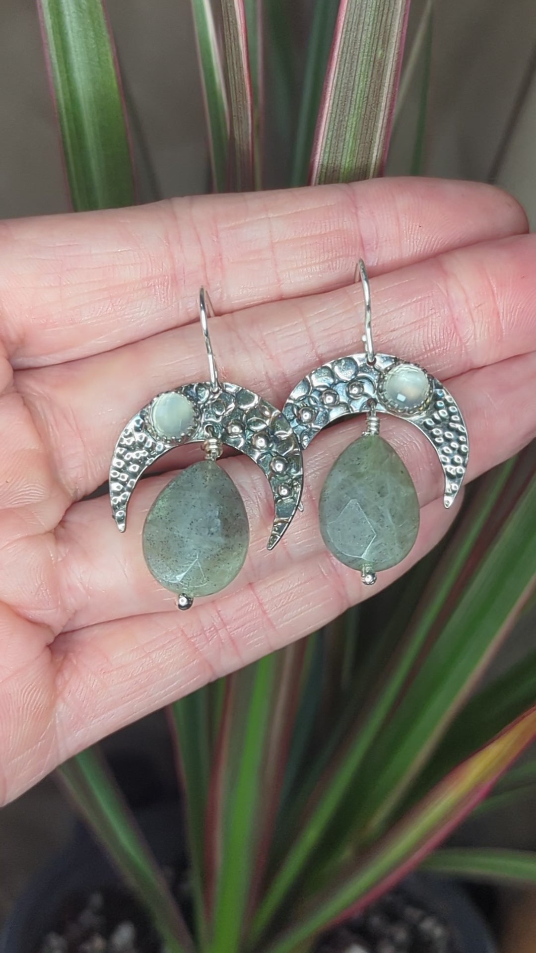 Experience the magic of the moon with our beautiful Magic Crystal Moon Earrings. These 925 silver earrings feature a faceted moonstone cabochon, representing the full moon, placed on a delicate crescent moon. Adorned with smokey facet moonstone beads, these earrings are a stunning representation of the moon's cycle. Elevate your style with these elegant and sophisticated earrings.