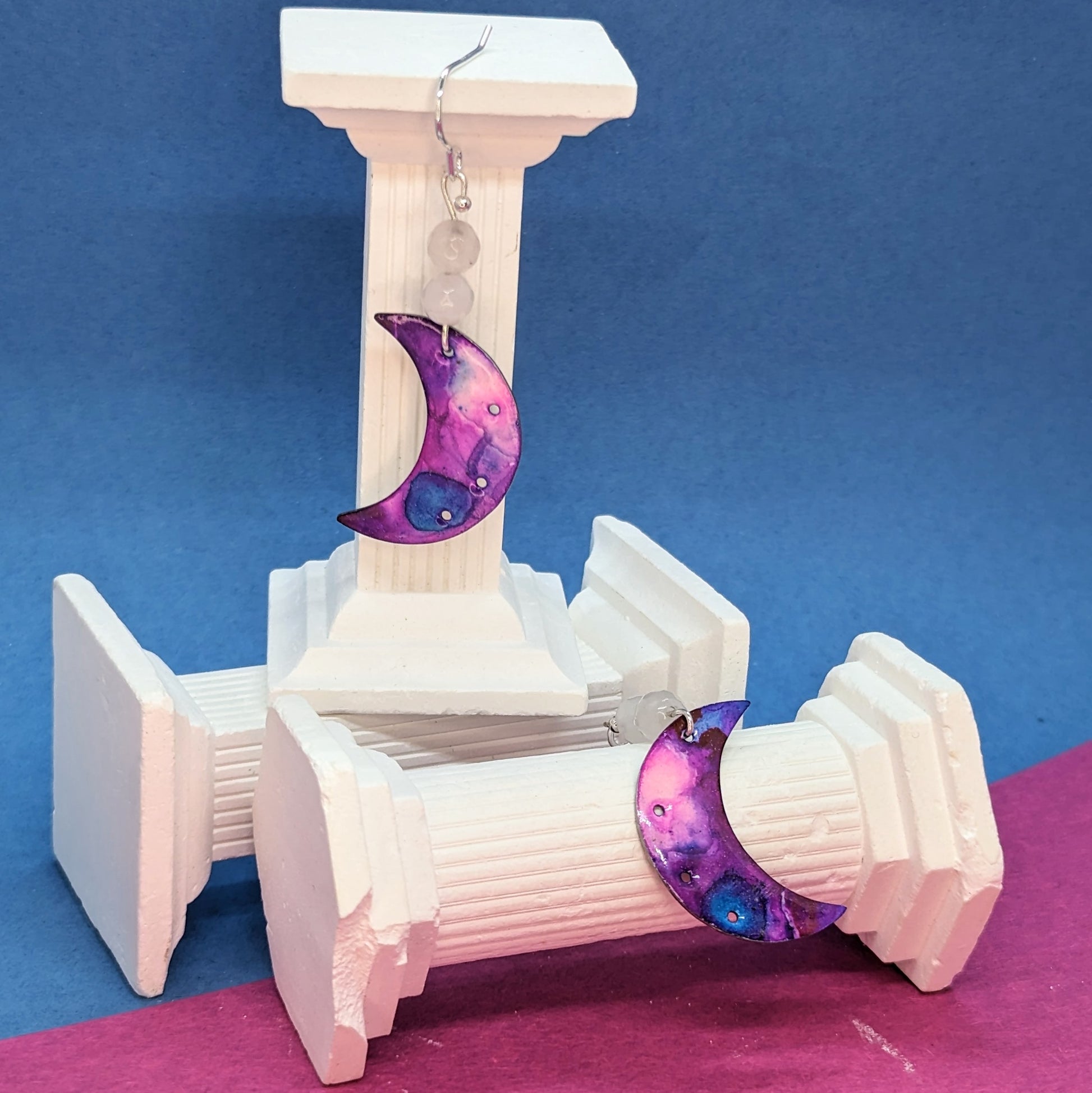 Moon earrings are enamel on aluminium for a lightweight design and come with sterling silver earing hooks.